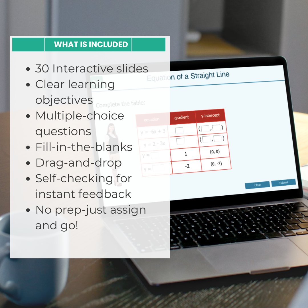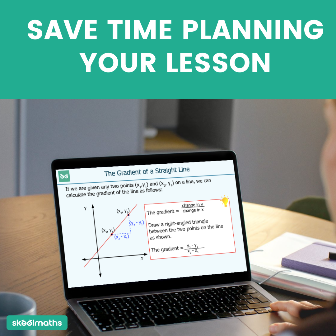 This high-engagement lesson is a completely interactive lesson with differentiated activities and assessment questions for learners in learners in year 10 and year 11. In this lesson, learners will be able to use the form y = mx + c to identify parallel {and perpendicular} lines; find the equation of the line through 2 given points, or through 1 point with a given gradient.